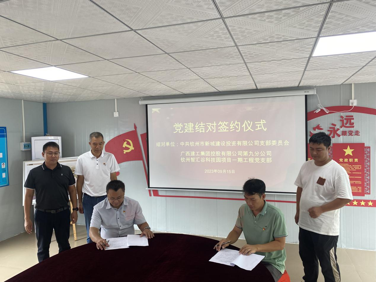 為充分發(fā)揮黨建引領(lǐng)作用,護(hù)航項(xiàng)目建設(shè)質(zhì)量、安全生產(chǎn),促進(jìn)市重點(diǎn)項(xiàng)目建設(shè)提速增效,2023年9月15日,建投公司黨支部與廣西建工集團(tuán)欽州智匯谷科技園項(xiàng)目一期工程黨支部舉行黨建結(jié)對(duì)共建協(xié)議簽約儀式。集團(tuán)公司副總經(jīng)理、建投公司黨支部書(shū)記劉雙,欽州智匯谷科技園項(xiàng)目一期工程項(xiàng)目經(jīng)理劉鐘明等出席簽約儀式并簽約。