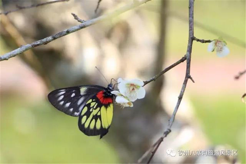 濃郁的花香吸引了眾多游客,在盛放的梅樹(shù)前擺出各種造型拍照,也引來(lái)了不少蝴蝶,在枝頭飛舞縈繞。