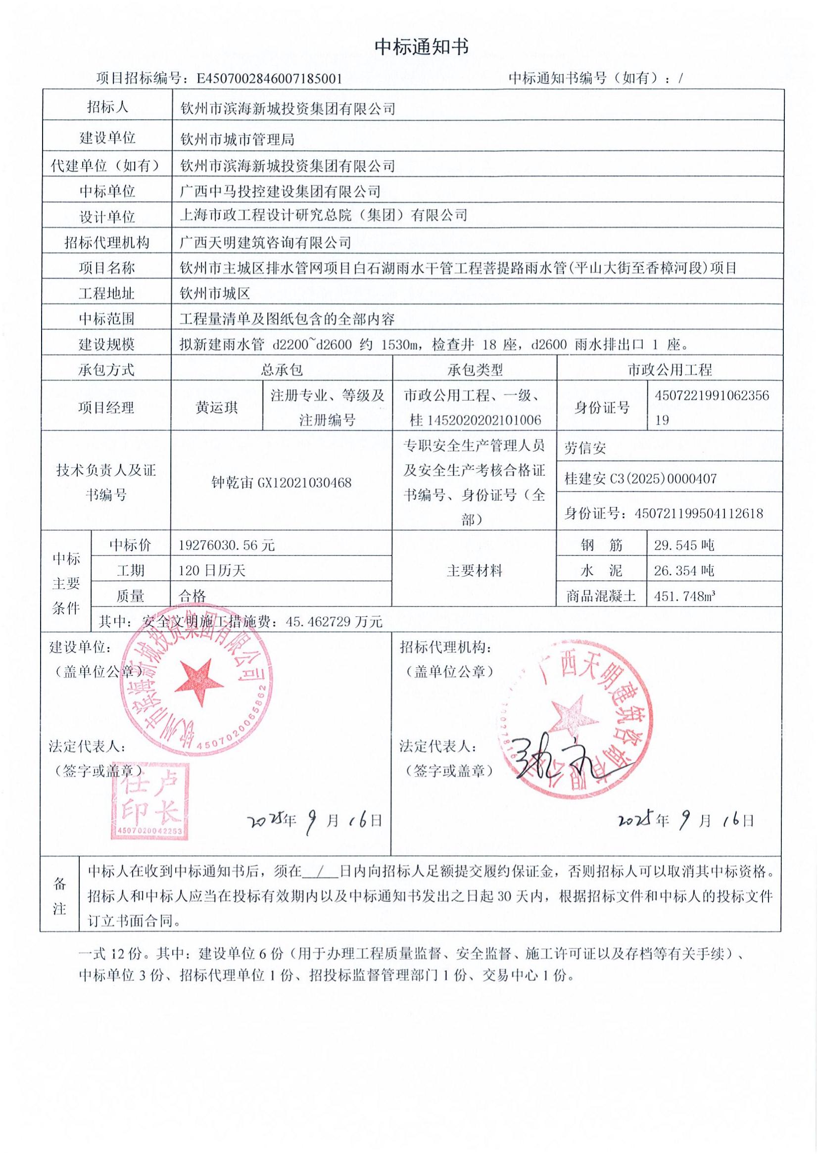 欽州市主城區(qū)排水管網項目白石湖雨水干管工程菩提路雨水管(平山大街至香樟河段)項目中標結果公示