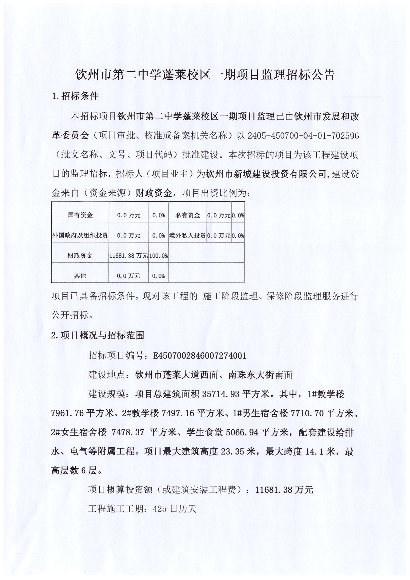 欽州市第二中學蓬萊校區(qū)一期項目監(jiān)理招標公告
