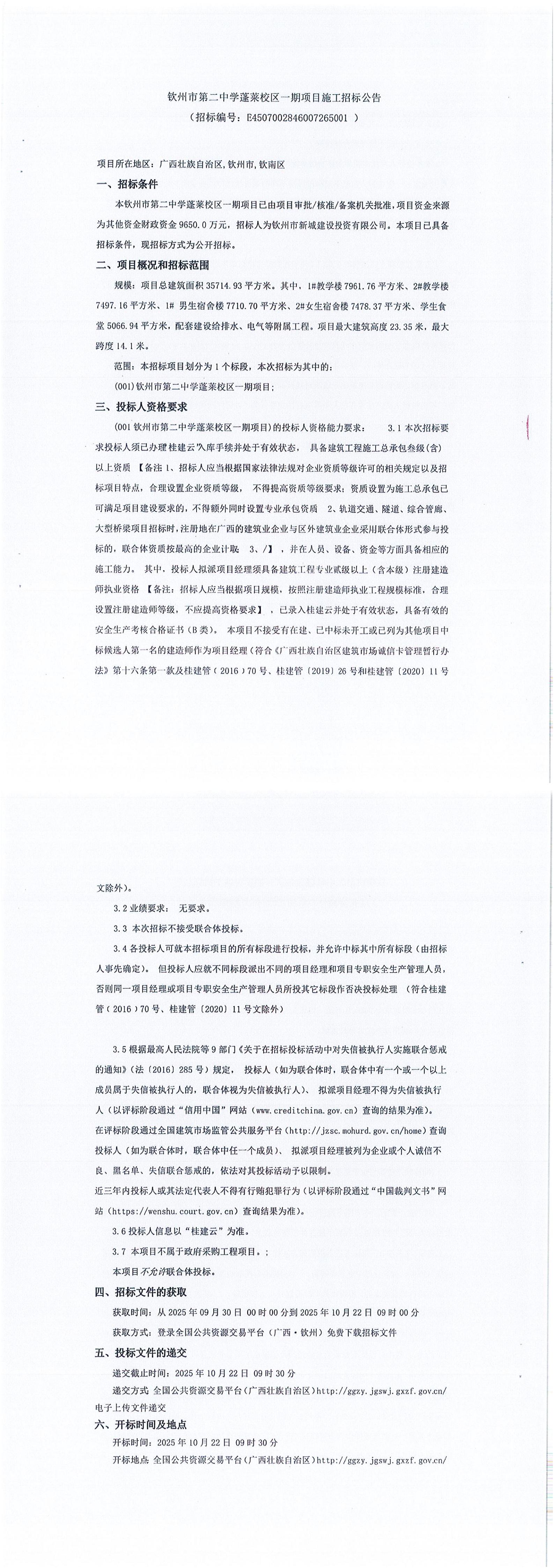 欽州市第二中學蓬萊校區(qū)一期項目施工招標公告