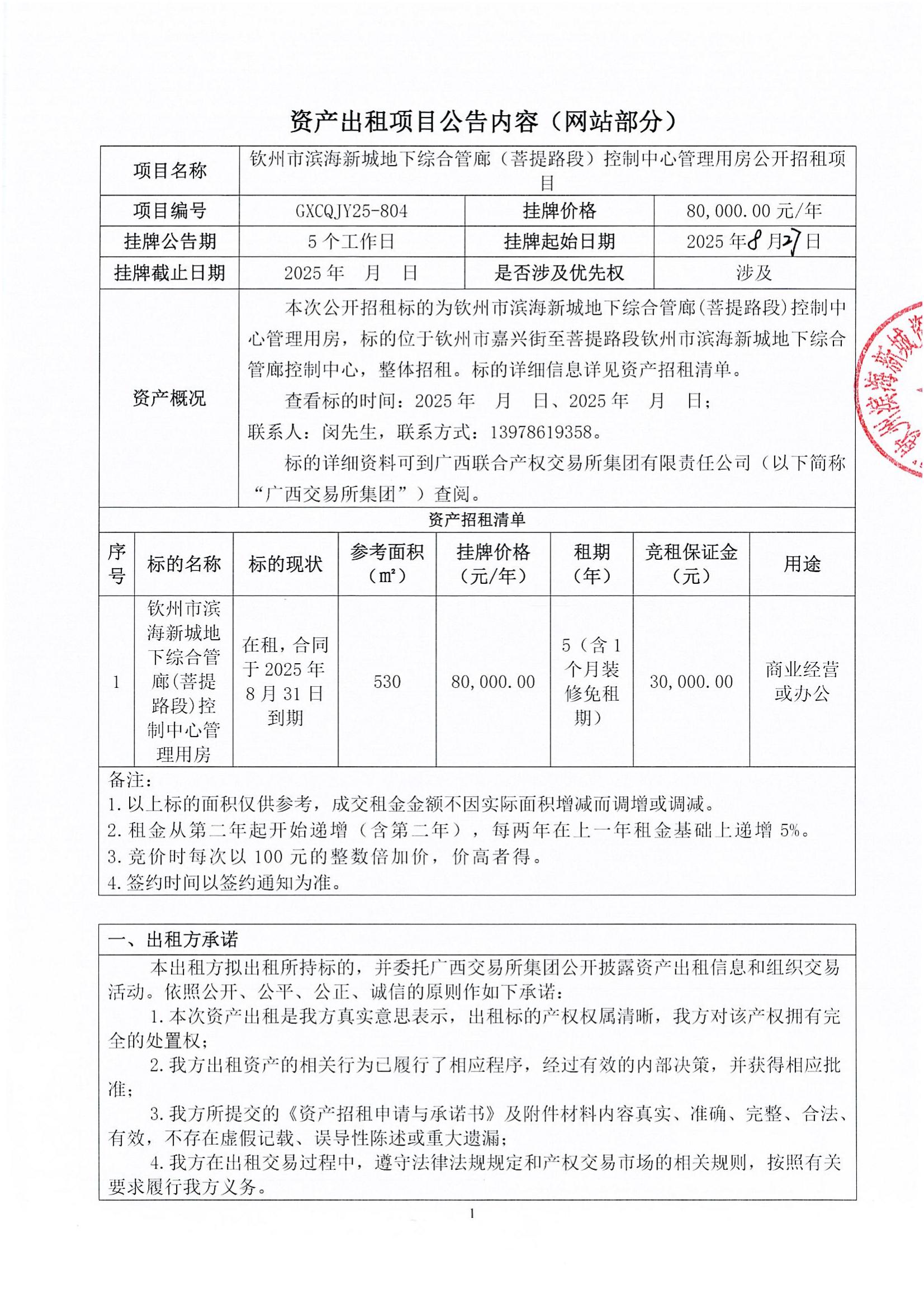 欽州市濱海新城地下綜合管廊(菩提路段)控制中心管理用房公開招租項(xiàng)目(GXCQJY25-804)成交公告