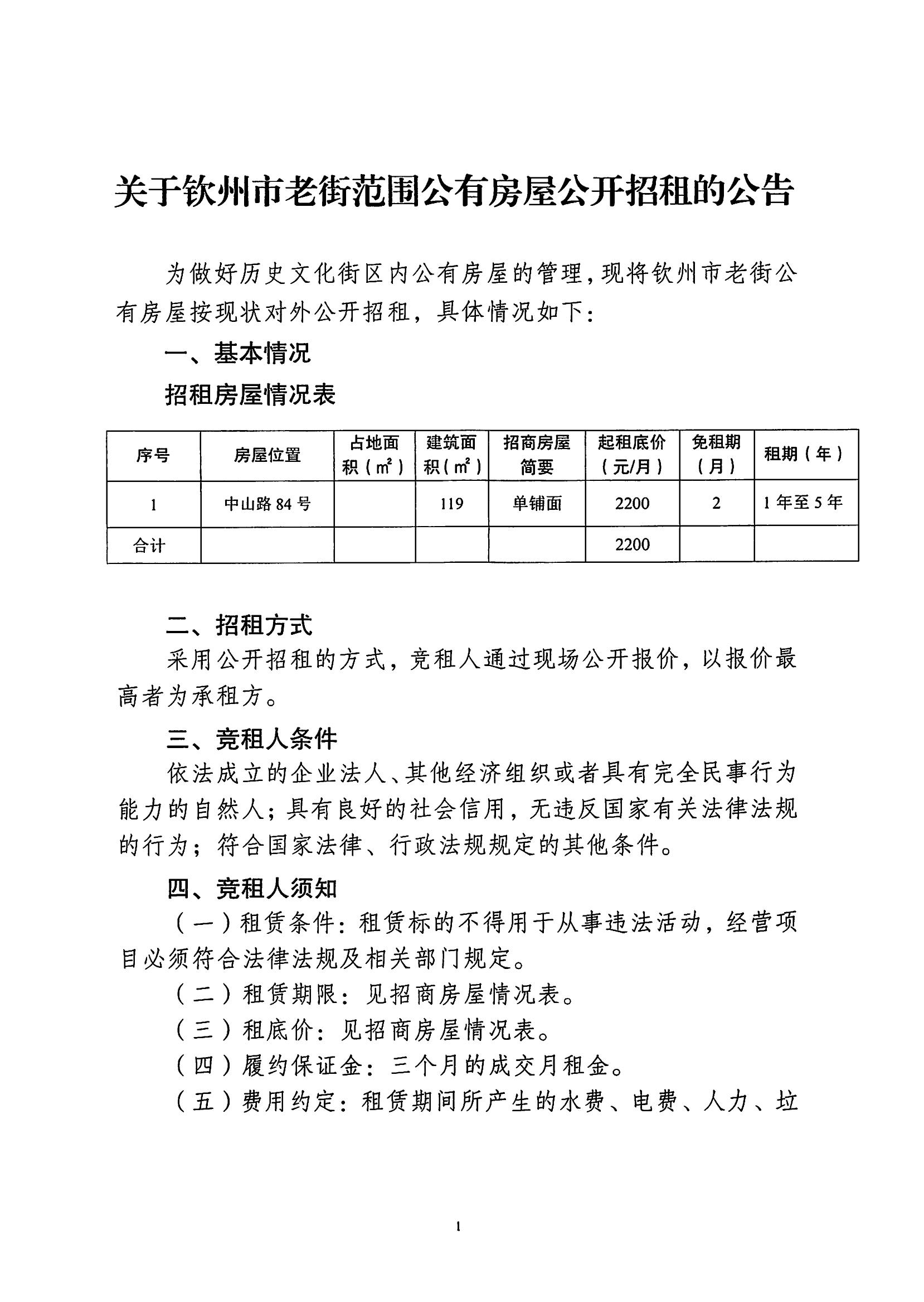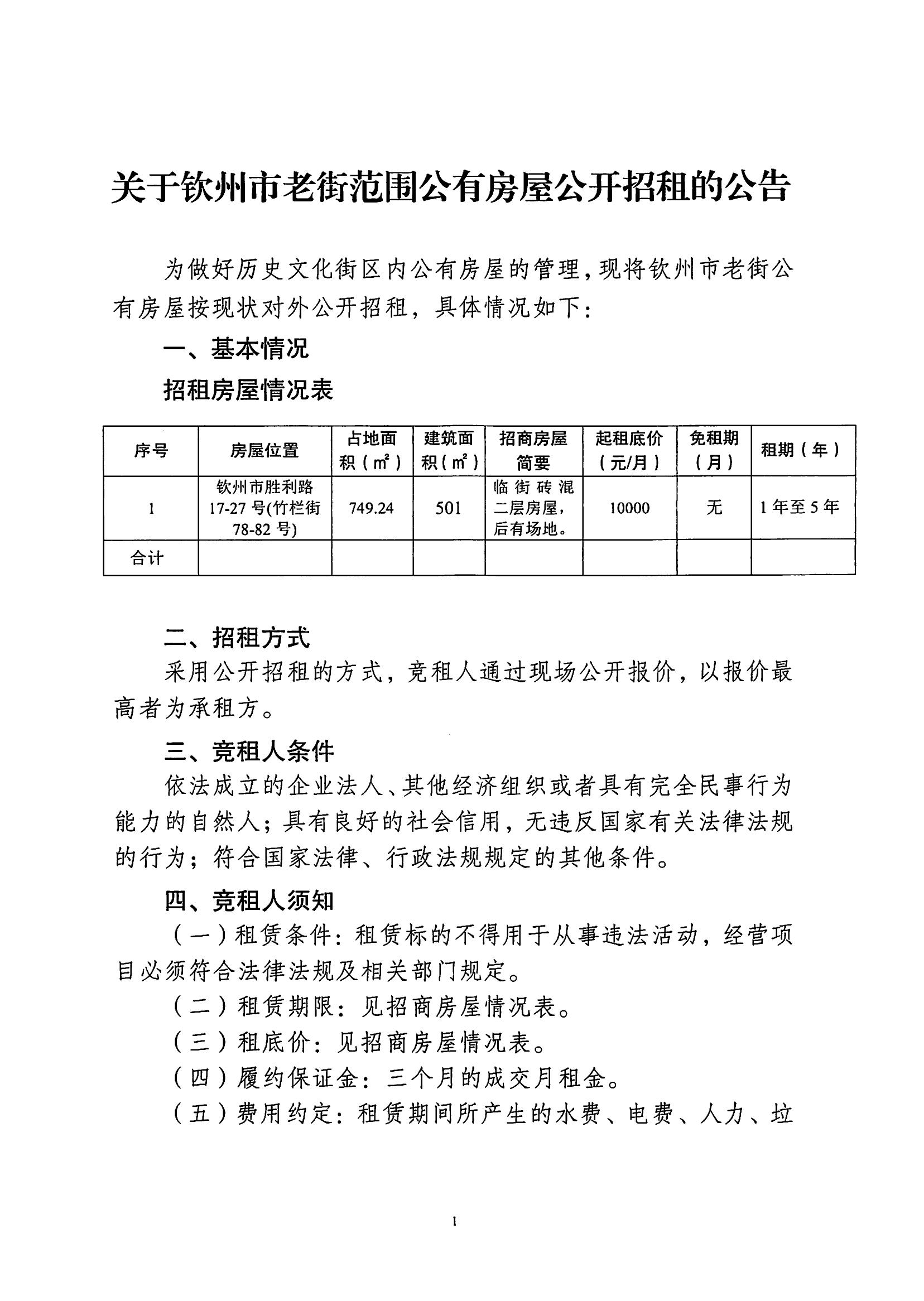 欽州市濱海文化旅游投資有限公司關(guān)于欽州市老街范圍1處房屋公開招租結(jié)果公示