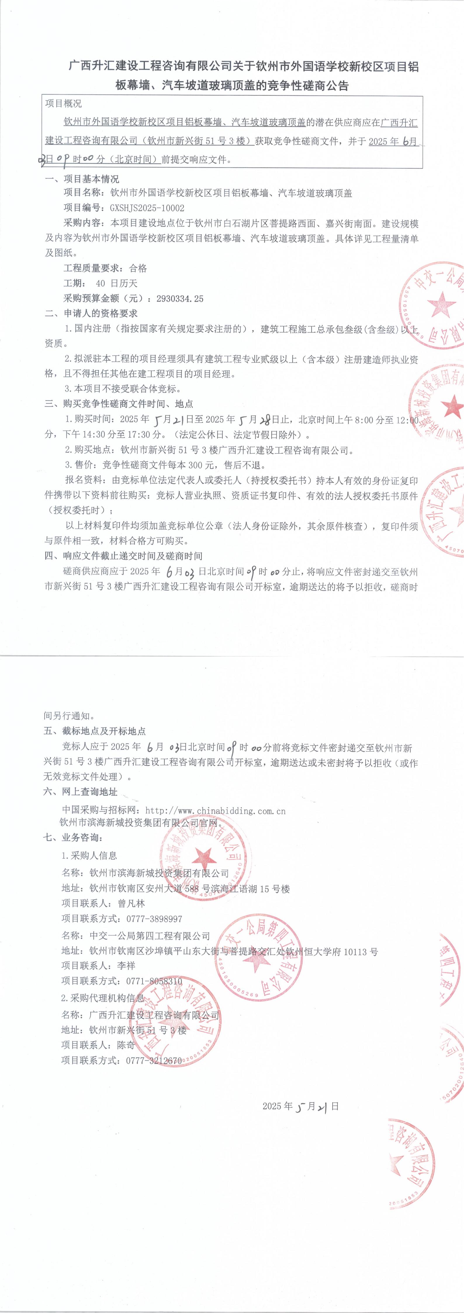 廣西升匯建設(shè)工程咨詢有限公司關(guān)于欽州市外國語學校新校區(qū)項目鋁板幕墻、汽車坡道玻璃頂蓋的競爭性磋商公告