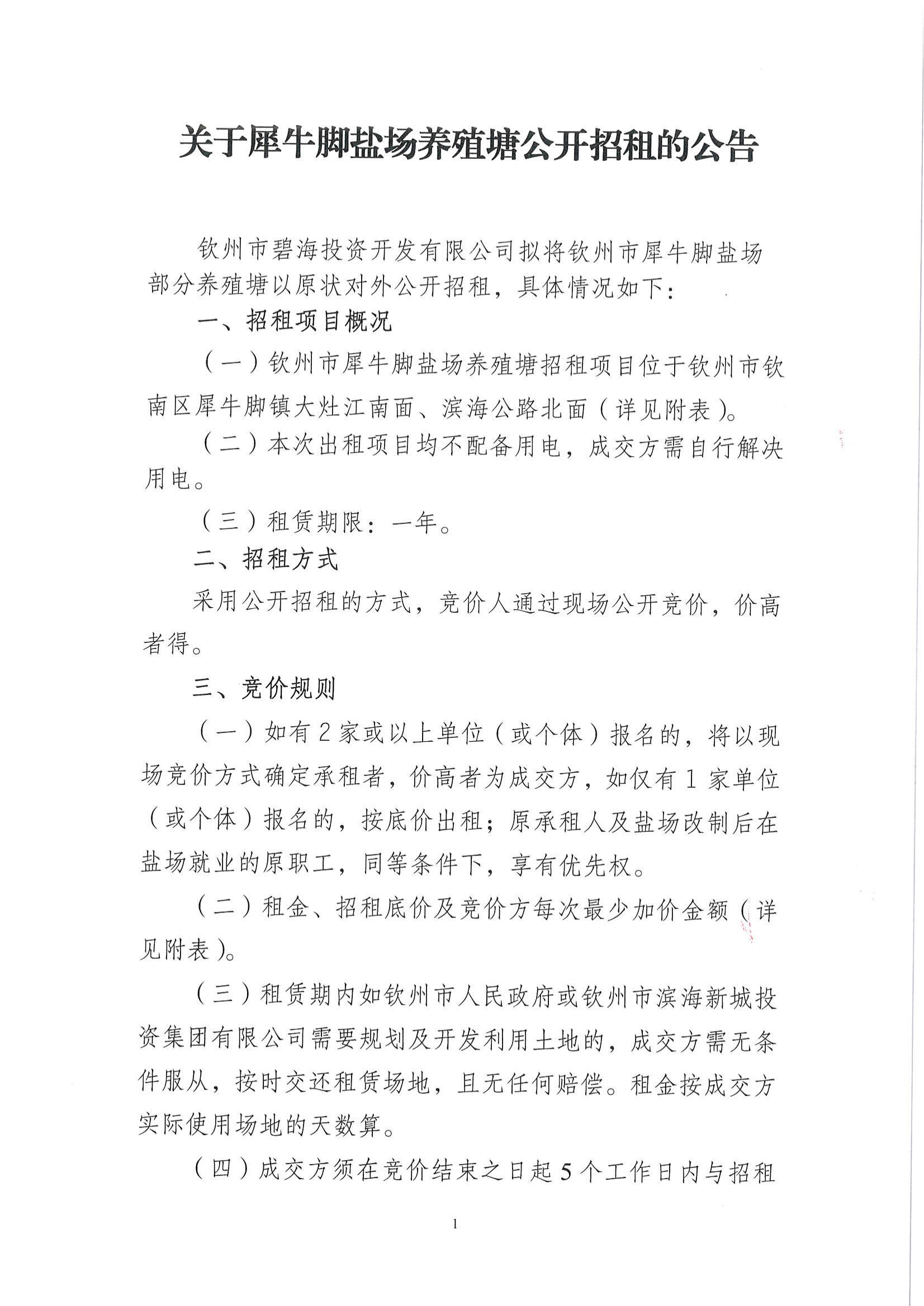 關于犀牛腳鹽場養(yǎng)殖塘公開招租的公告