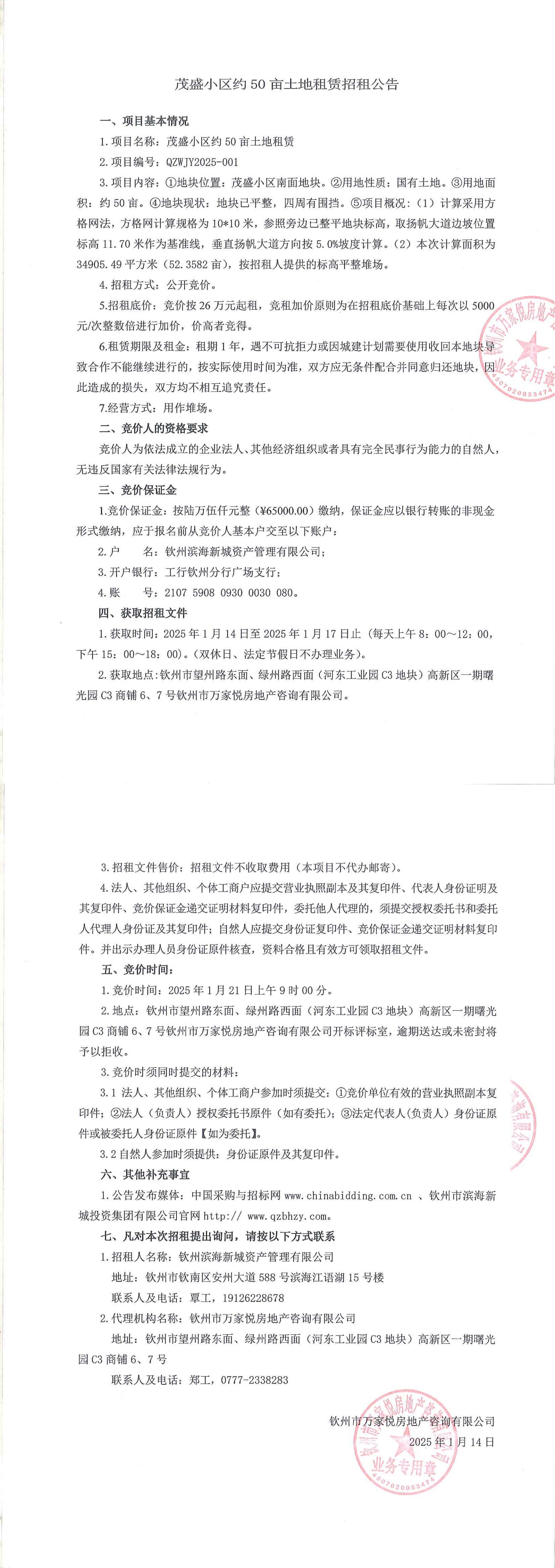 茂盛小區(qū)約50畝土地租賃(QZWJY2025-001)成交結果公告