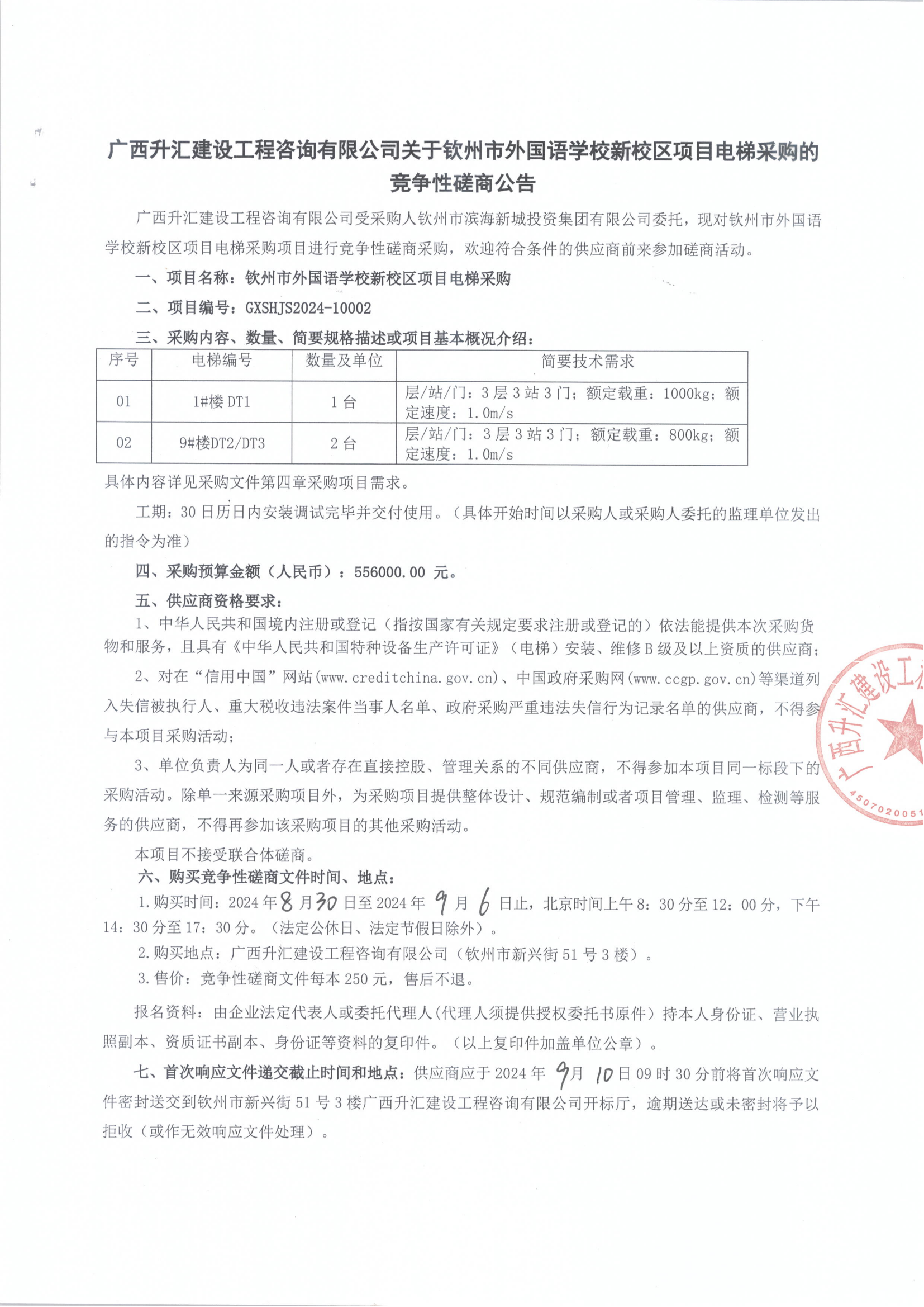 廣西升匯建設(shè)工程咨詢有限公司關(guān)于欽州市外國語學(xué)校新校區(qū)項(xiàng)目電梯采購的競爭性磋商公告