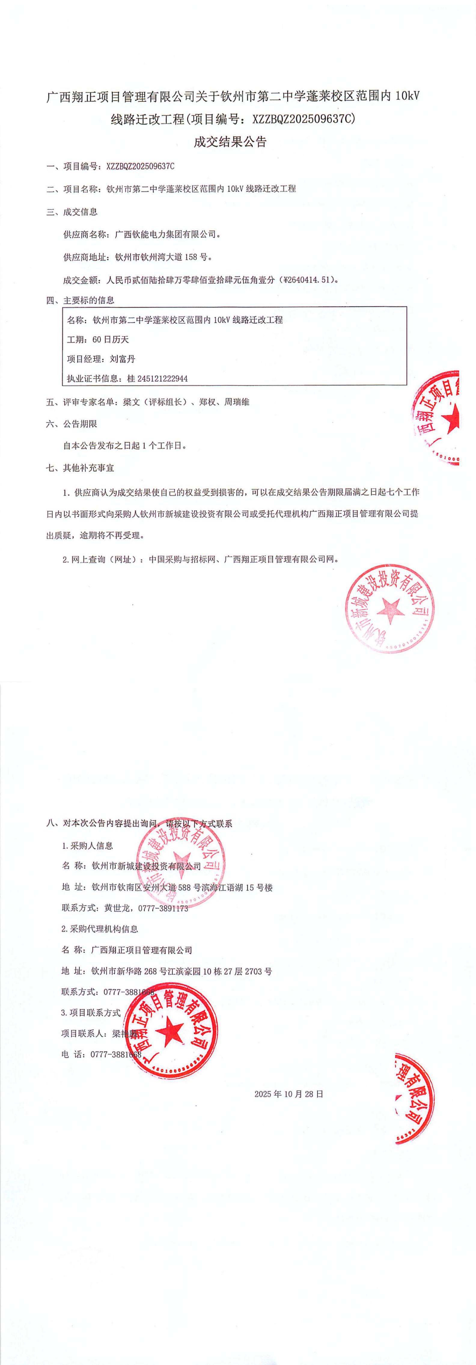 關(guān)于欽州市第二中學(xué)蓬萊校區(qū)范圍內(nèi)10kV線路遷改工程(項(xiàng)目編號:XZZBQZ202509637C)成交結(jié)果公告