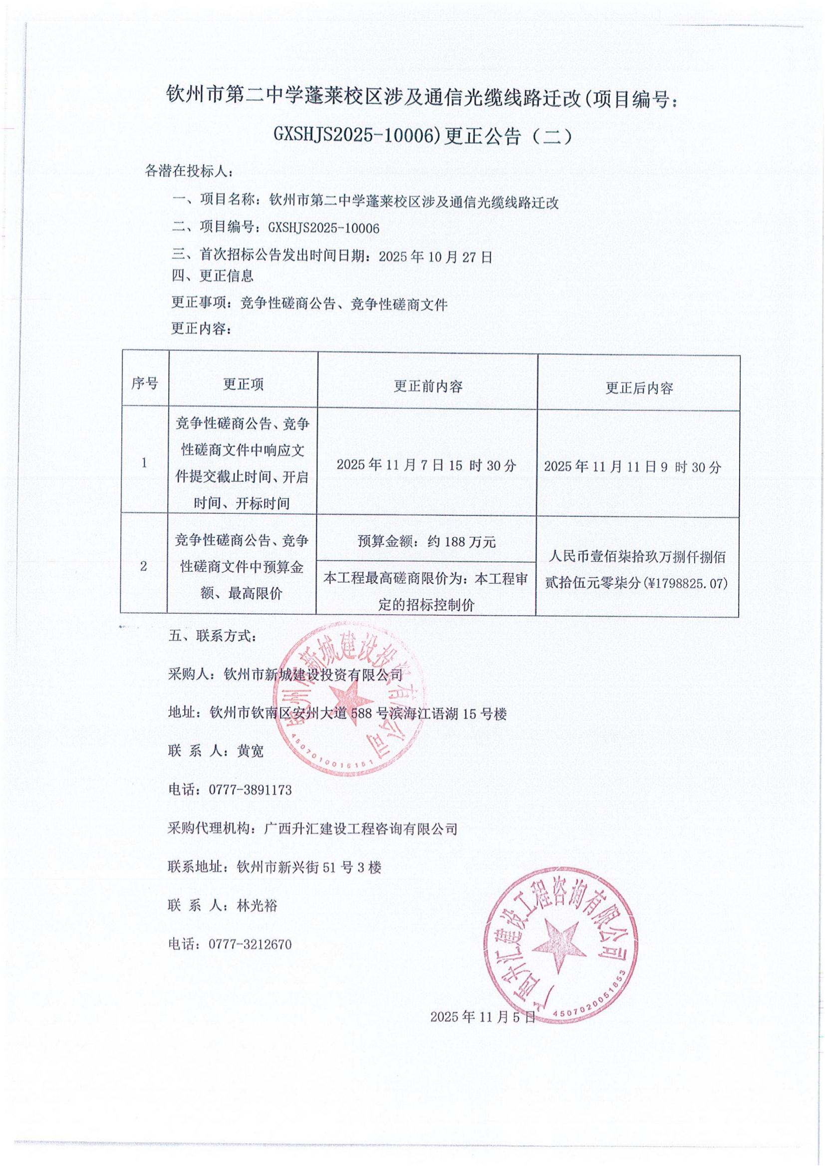 欽州市第二中學(xué)蓬萊校區(qū)涉及通信光纜線路遷改(項(xiàng)目編號: GXSHJS2025-10006)更正公告(二)