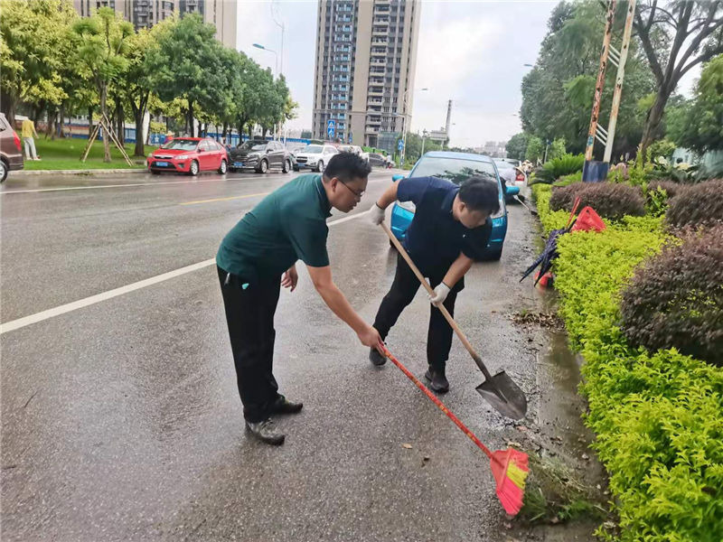 活動當(dāng)天,煙雨朦朧。志愿者們有的拿著鏟子,有的拿著掃把,有的拿著垃圾簍,冒雨干起活來。