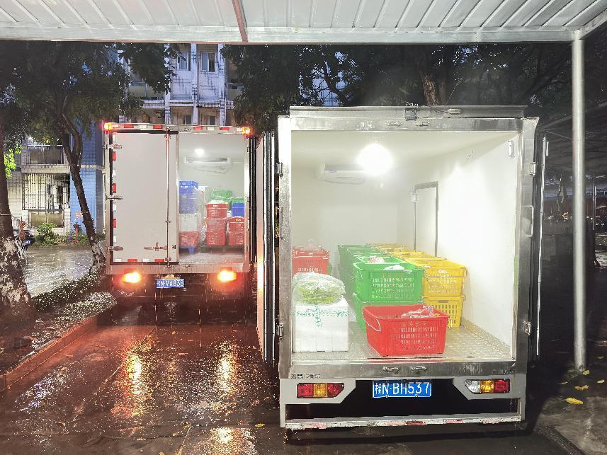 圖為凌晨?jī)牲c(diǎn),濱海食材公共配送中心的倉(cāng)庫(kù)燈火通明,冷鏈車整裝待發(fā)