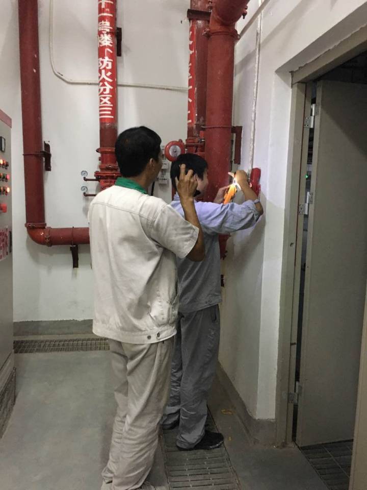 圖為消防維保單位及物業(yè)工程人員在進行現(xiàn)場消防設施檢查