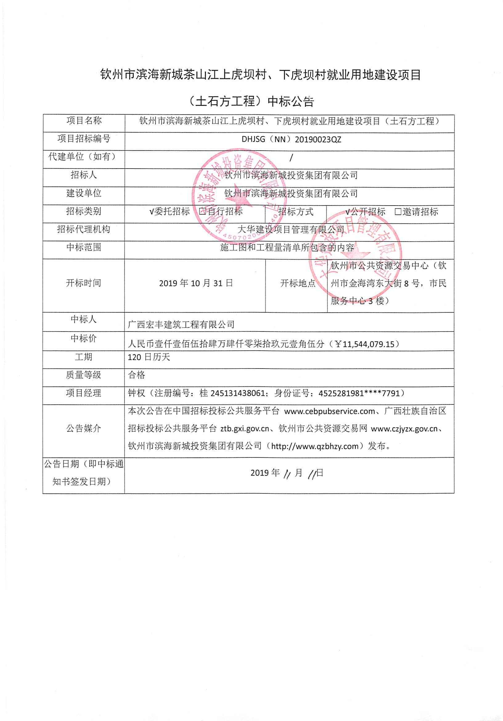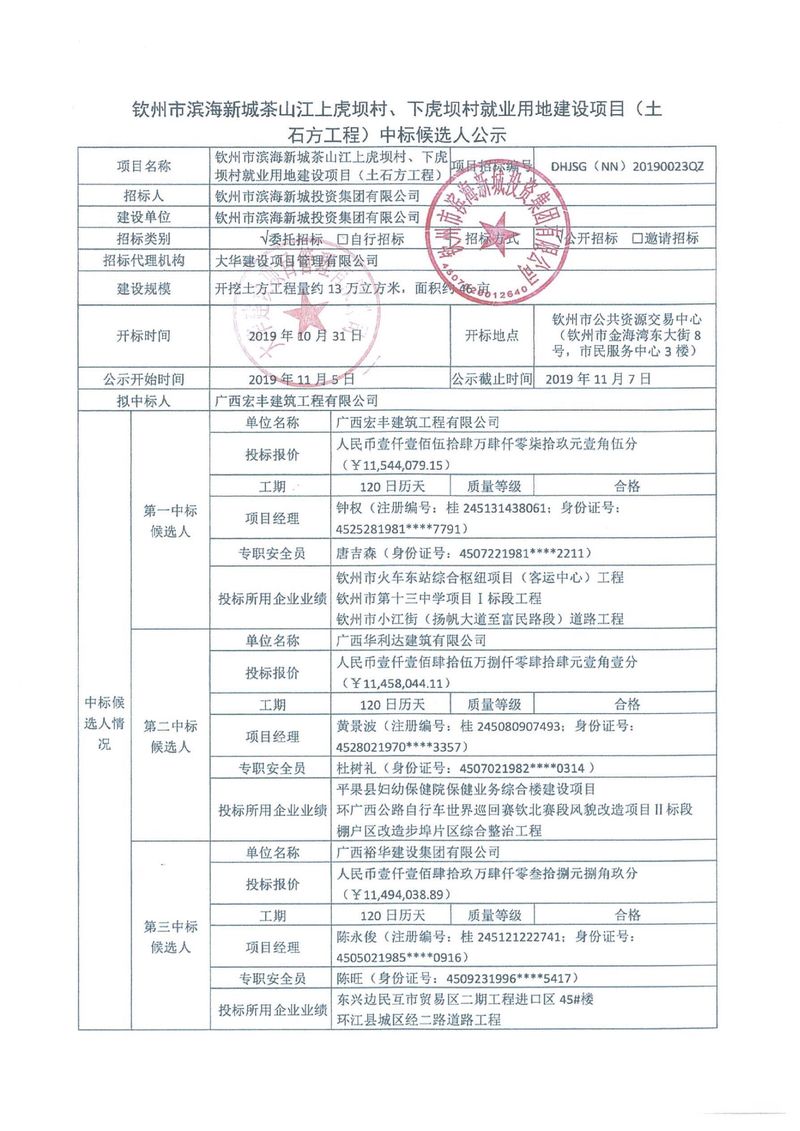 欽州市濱海新城茶山江上虎壩村、下虎壩村就業(yè)用地建設(shè)項目(土石方工程)中標(biāo)公示