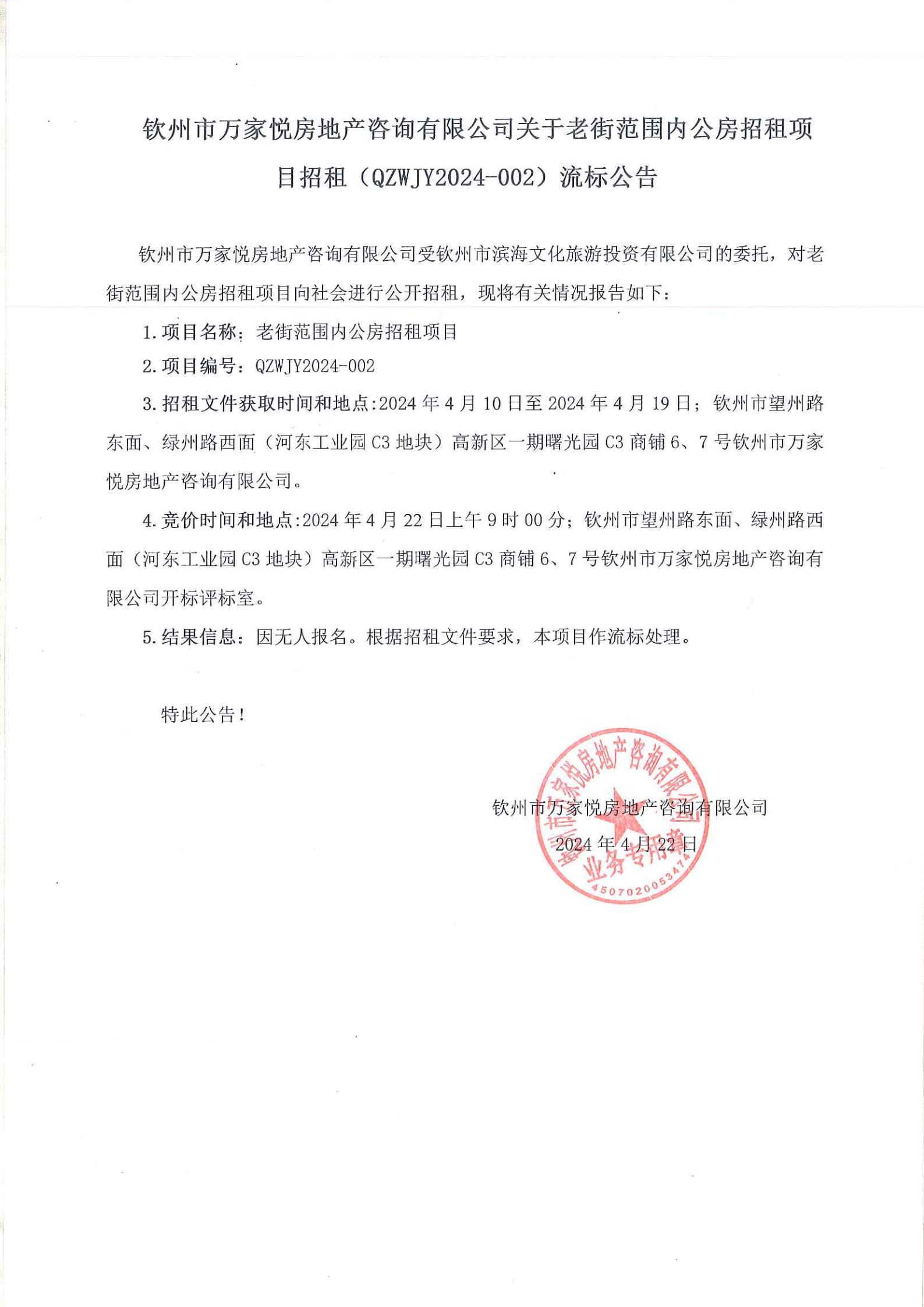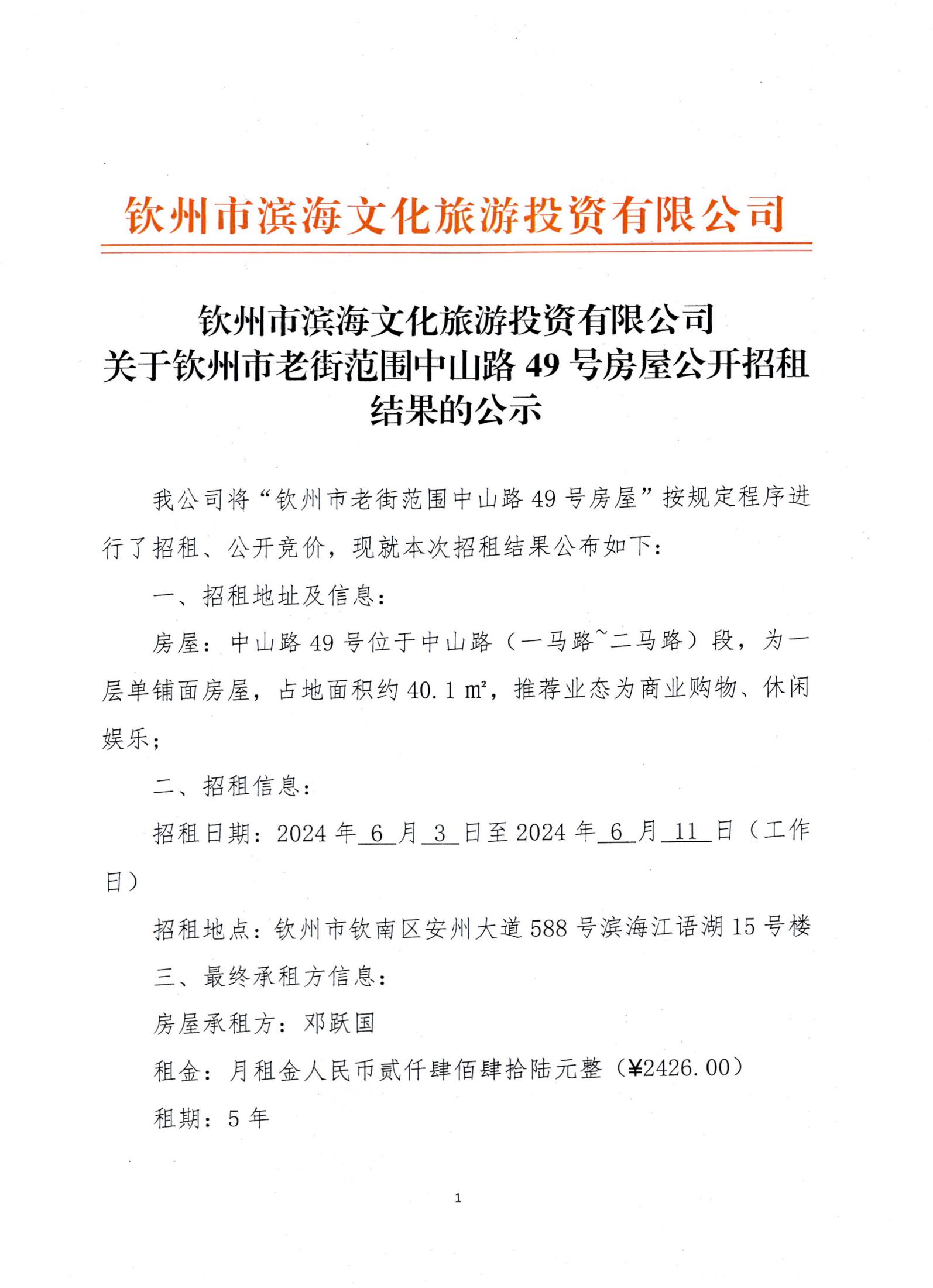 關(guān)于欽州市老街范圍中山路49號(hào)房屋公開(kāi)招租結(jié)果的公示