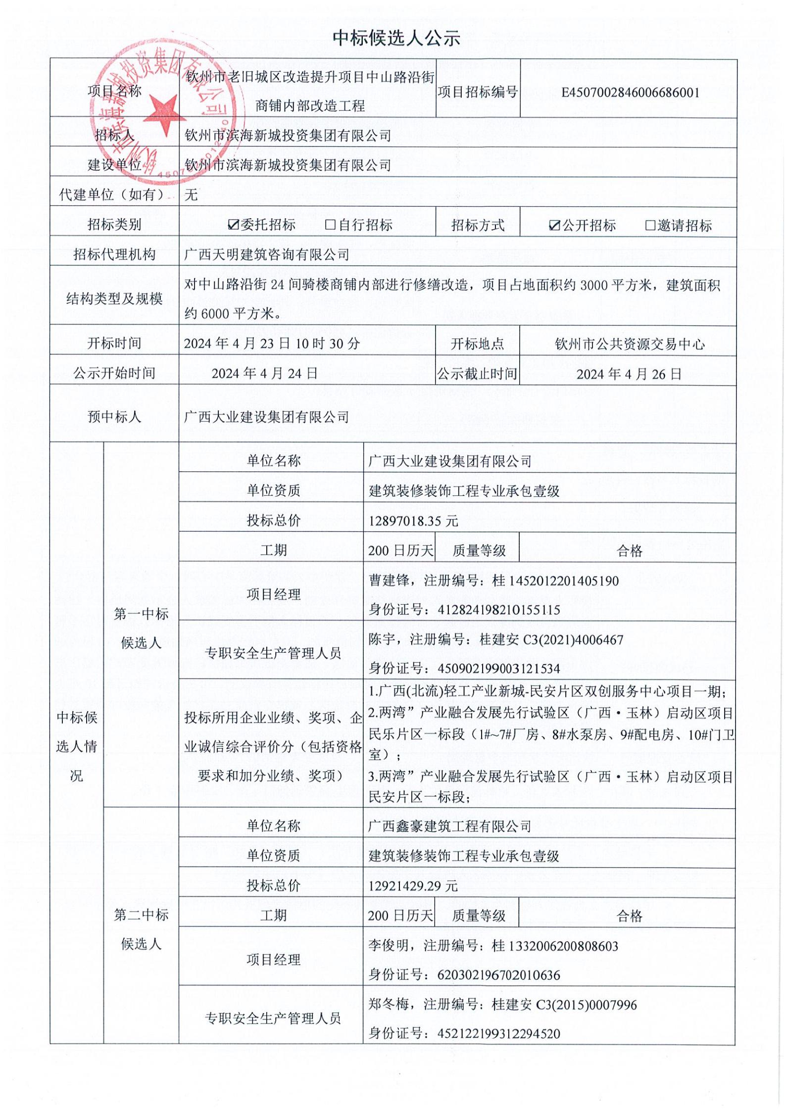 欽州市老舊城區(qū)改造提升項(xiàng)目中山路沿街商鋪內(nèi)部改造工程中標(biāo)候選人公示
