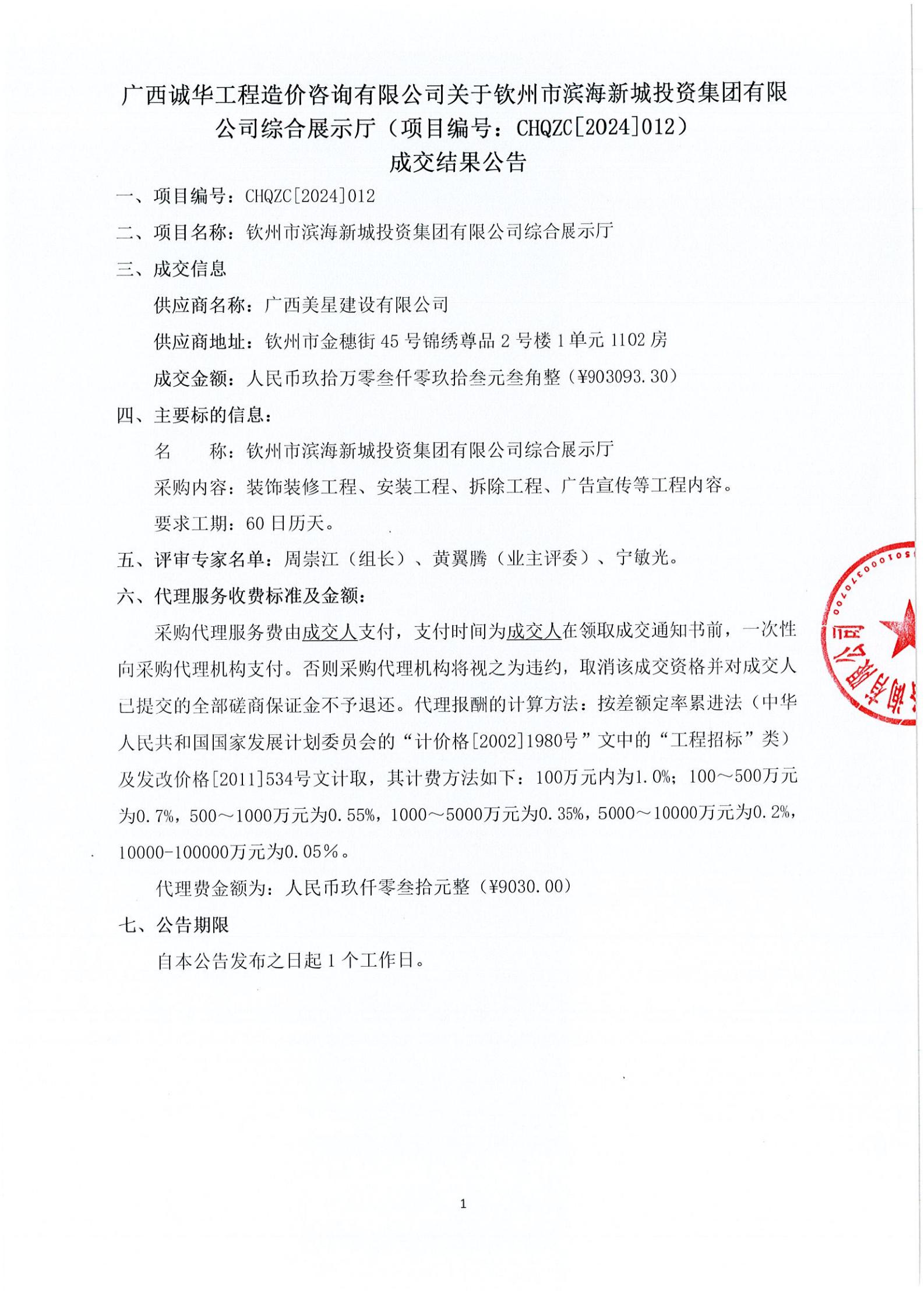 關(guān)于欽州市濱海新城投資集團(tuán)有限公司綜合展示廳成交結(jié)果公告