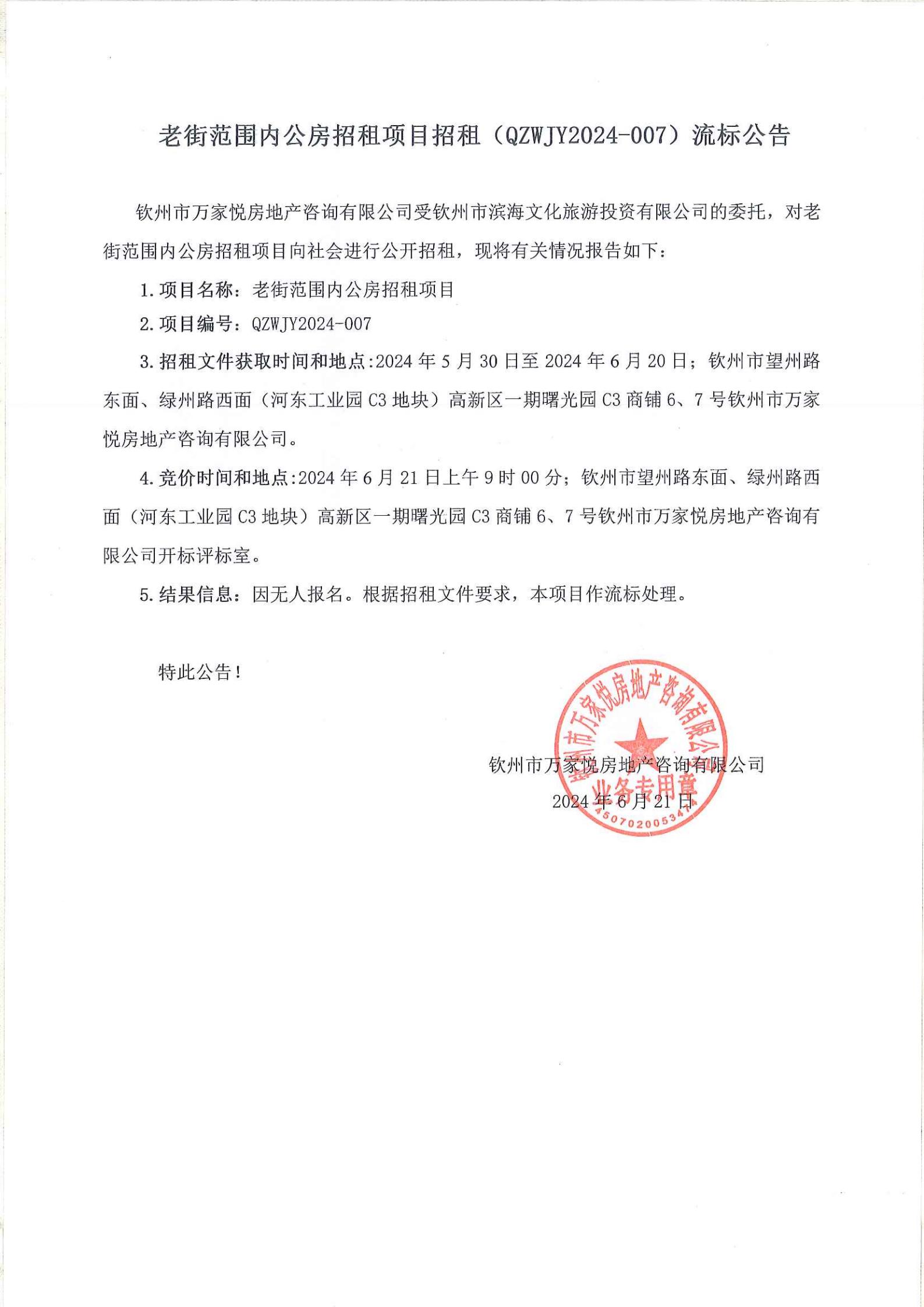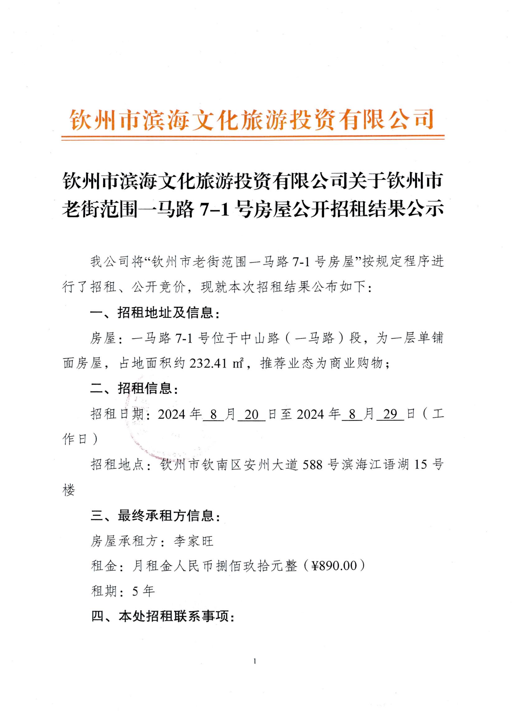 關(guān)于欽州市老街范圍一馬路7-1號(hào)房屋公開(kāi)招租結(jié)果公示