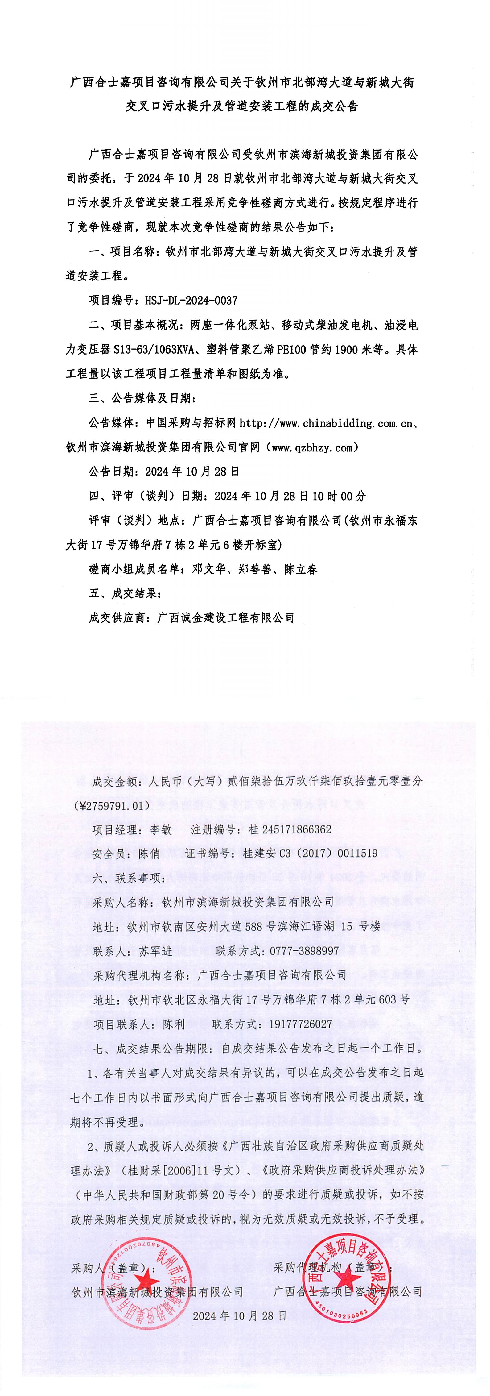 關(guān)于欽州市北部灣大道與新城大街交叉口污水提升及管道安裝工程的成交公告