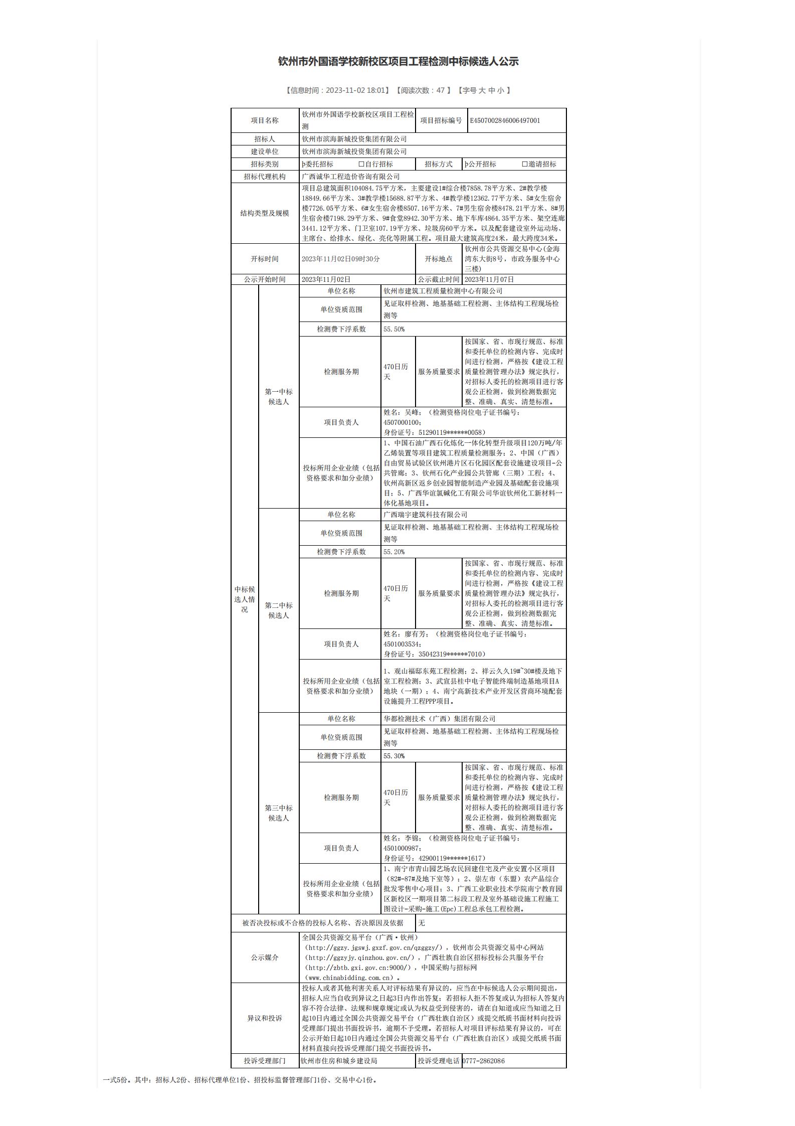 欽州市外國語學(xué)校新校區(qū)項目工程檢測中標候選人公示