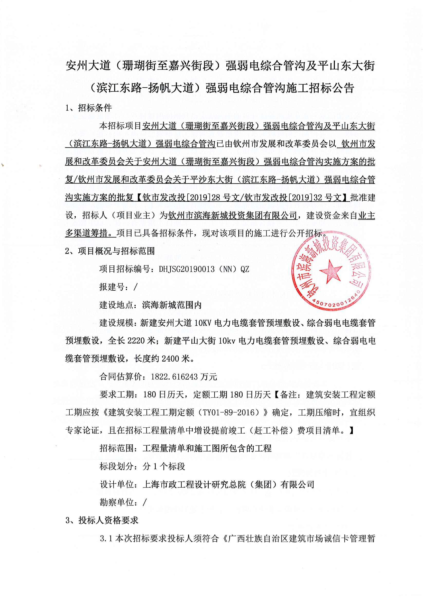 安州大道(珊瑚街至嘉興街段)強弱電綜合管溝及平山東大街(濱江東路-揚帆大道)強弱電綜合管溝施工招標公告