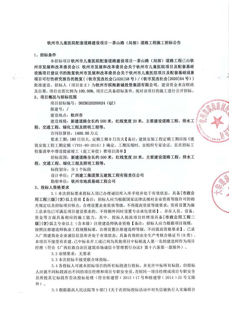 欽州市兒童醫(yī)院配套道路建設(shè)項目—茶山路(局部)道路工程施工招標公告
