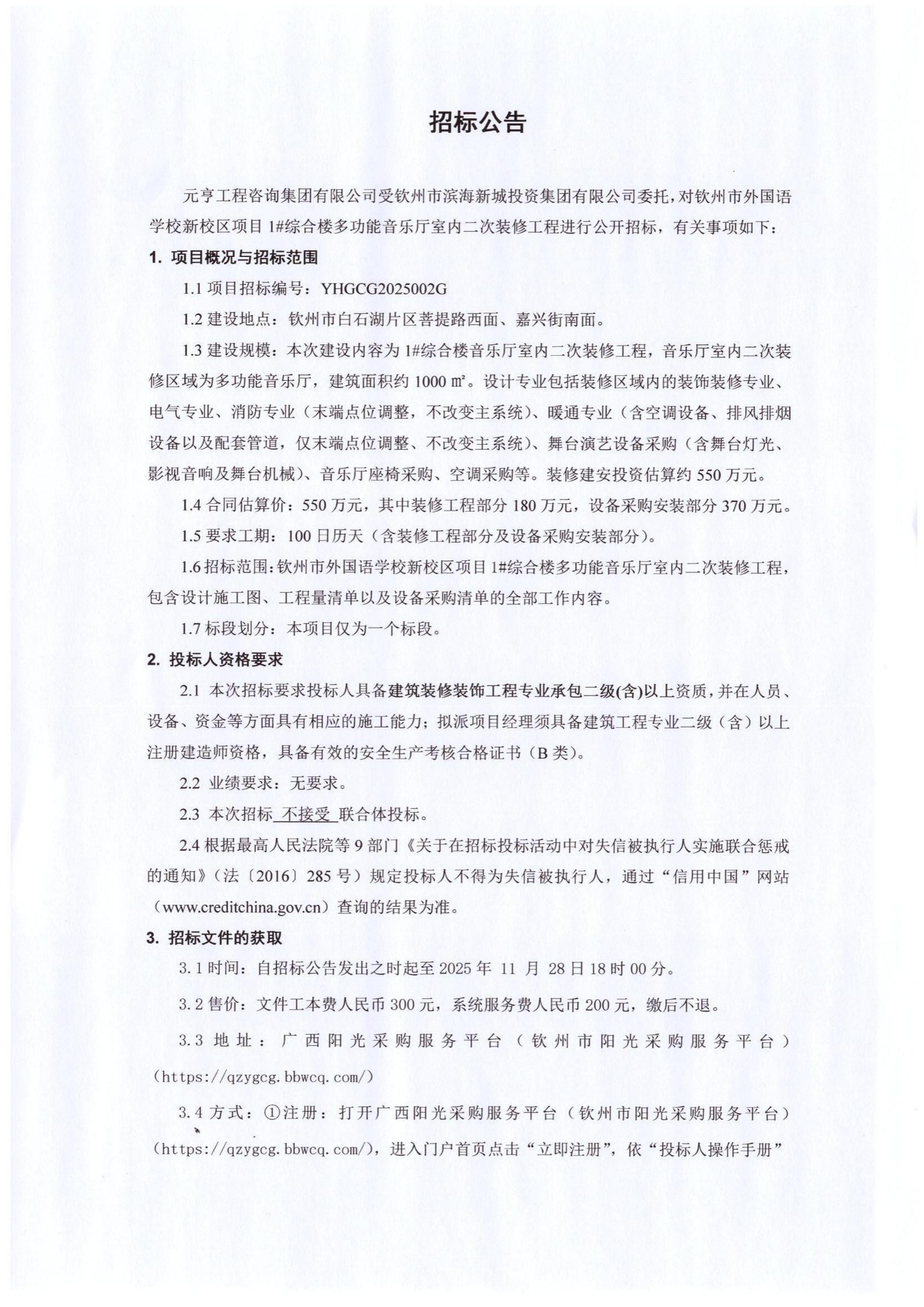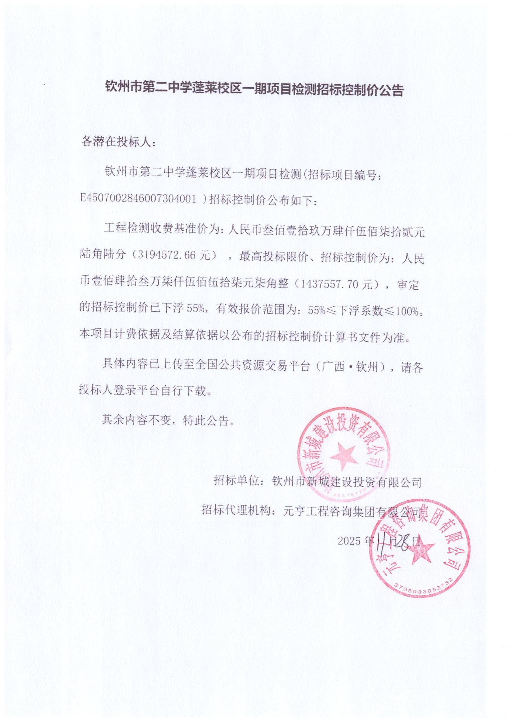 欽州市第二中學(xué)蓬萊校區(qū)一期項目檢測招標(biāo)控制價公告