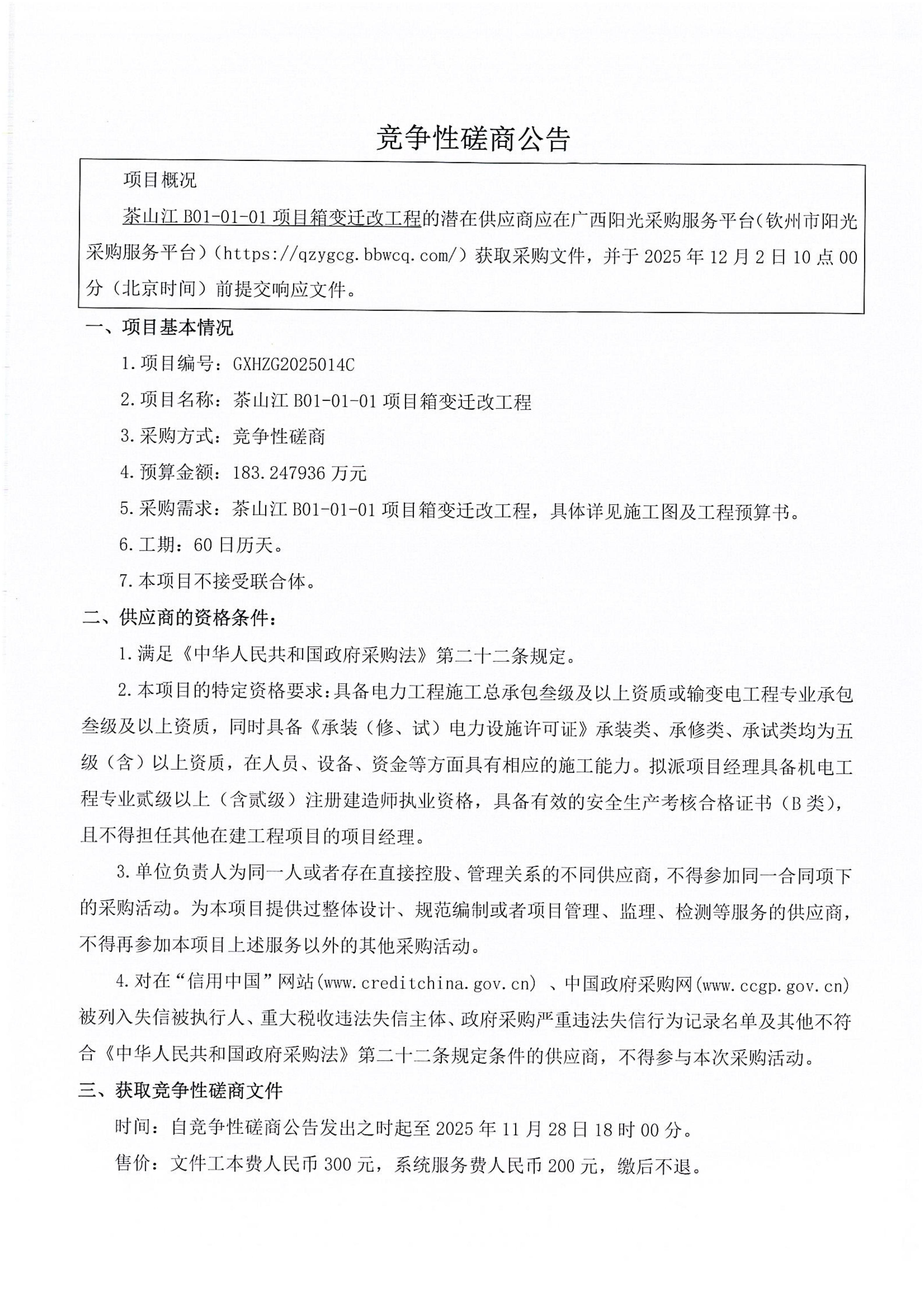 茶山江B01-01-01箱變遷改工程競爭性磋商公告