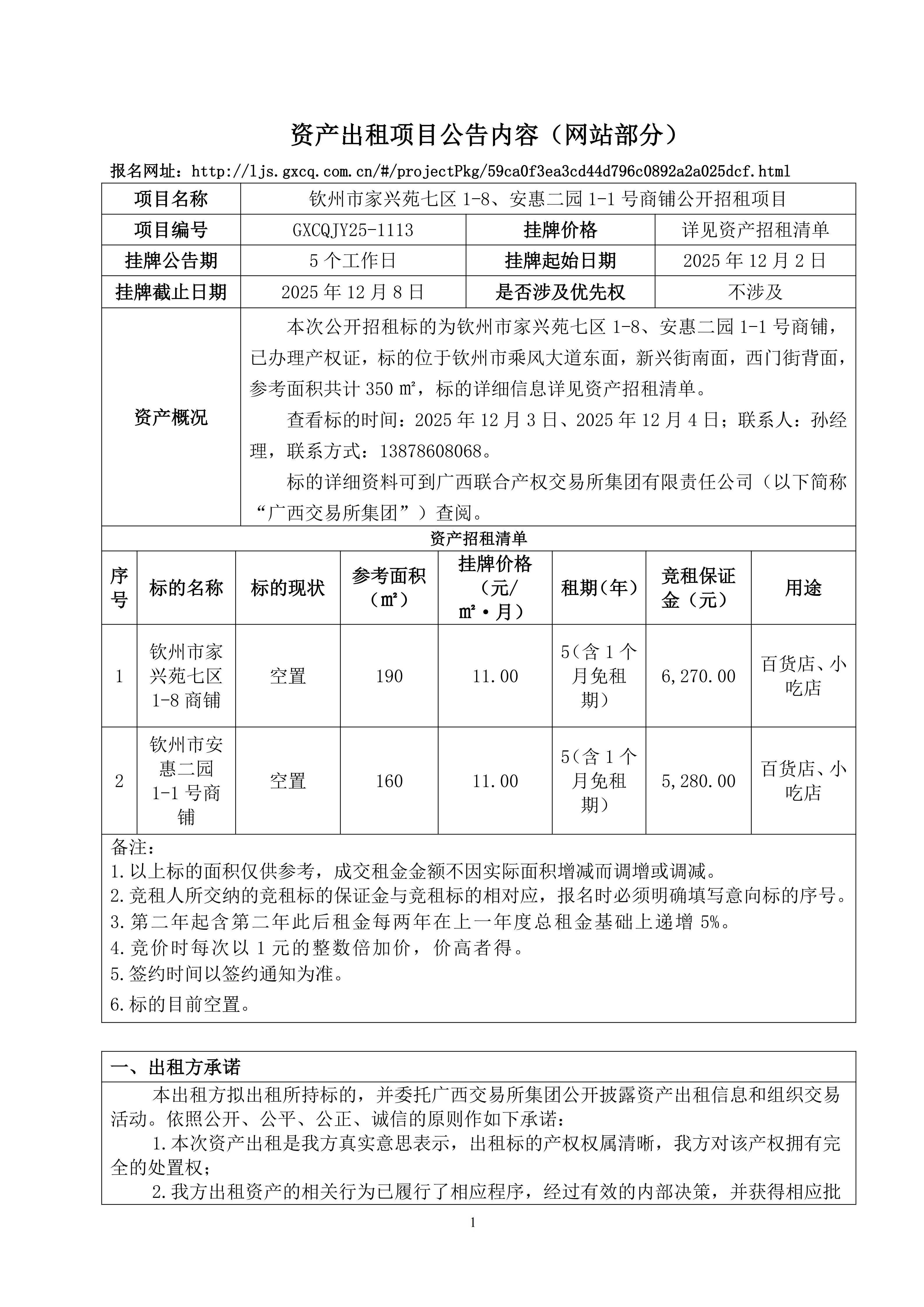 欽州市家興苑七區(qū)1-8、安惠二園1-1號商鋪公開招租項目