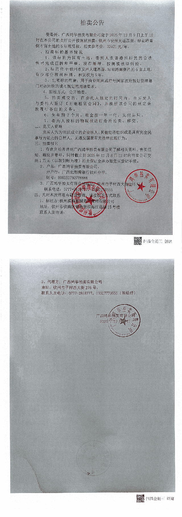 拍賣公告(欽州市安州大道西面、站前路南側(cè)6畝土地的5年租賃權(quán))