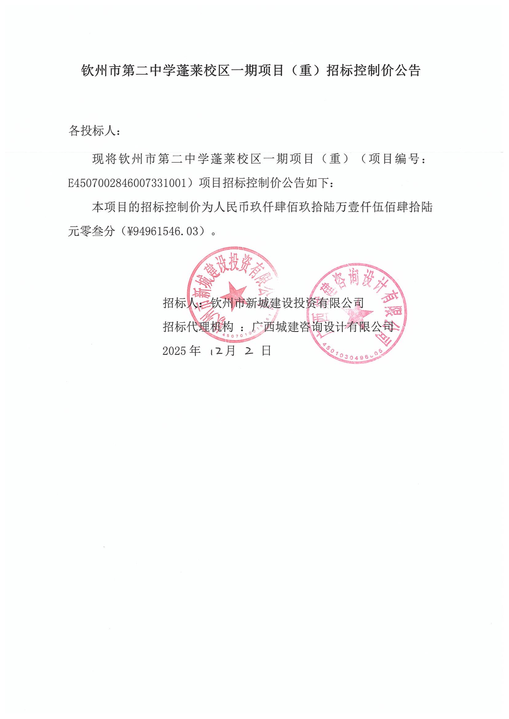 欽州市第二中學(xué)蓬萊校區(qū)一期項目(重)招標(biāo)控制價公告