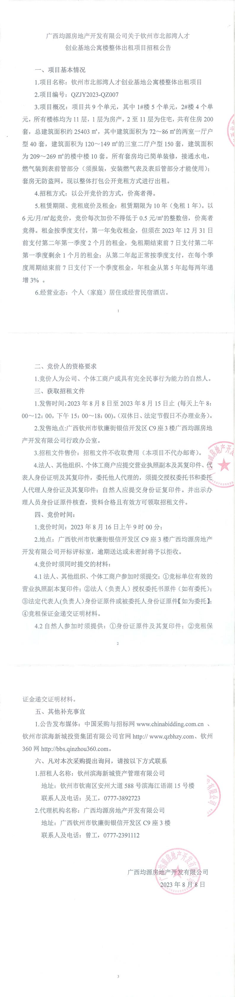欽州市北部灣人才創(chuàng)業(yè)基地公寓樓整體出租項目招租公告