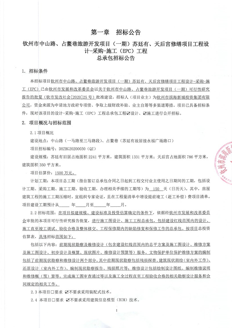 欽州市中山路、占鰲巷旅游開(kāi)發(fā)項(xiàng)目(一期)蘇廷有、天后宮修繕項(xiàng)目工程設(shè)計(jì)-采購(gòu)-施工(EPC)工程總承包招標(biāo)公告