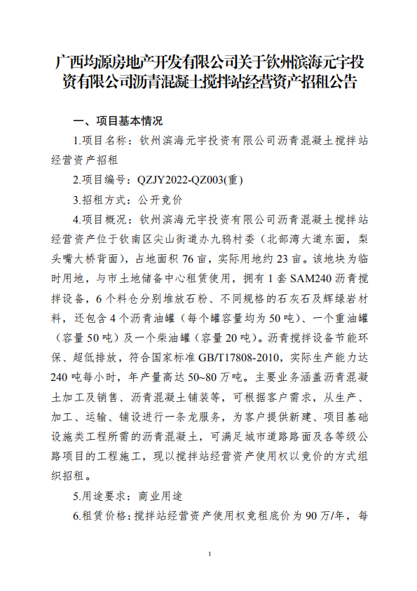 廣西均源房地產開發(fā)有限公司關于欽州濱海元宇投資有限公司瀝青混凝土攪拌站經營資產招租公告