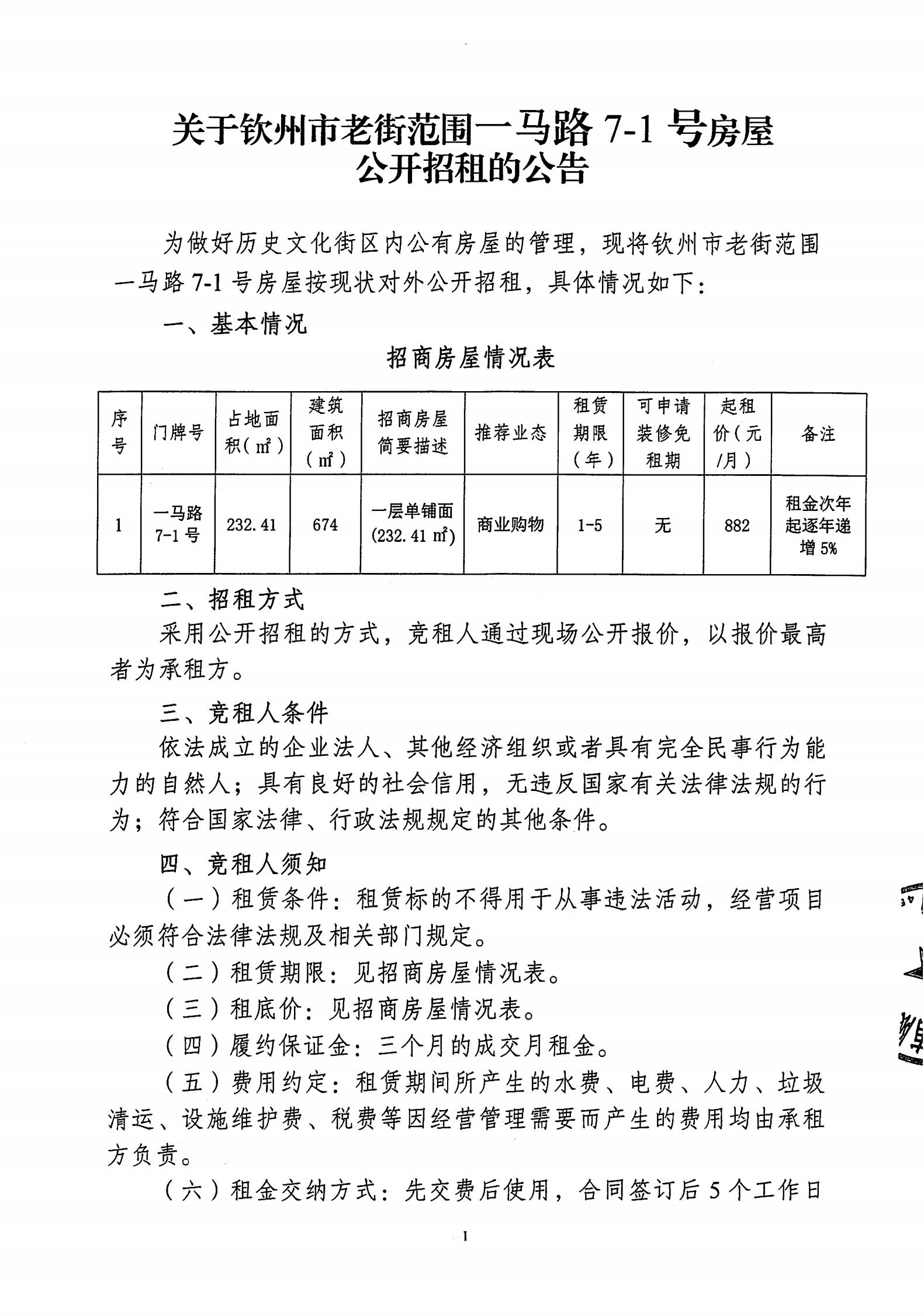 欽州市老街范圍一馬路7-1號(hào)房屋公開(kāi)招租招租文件