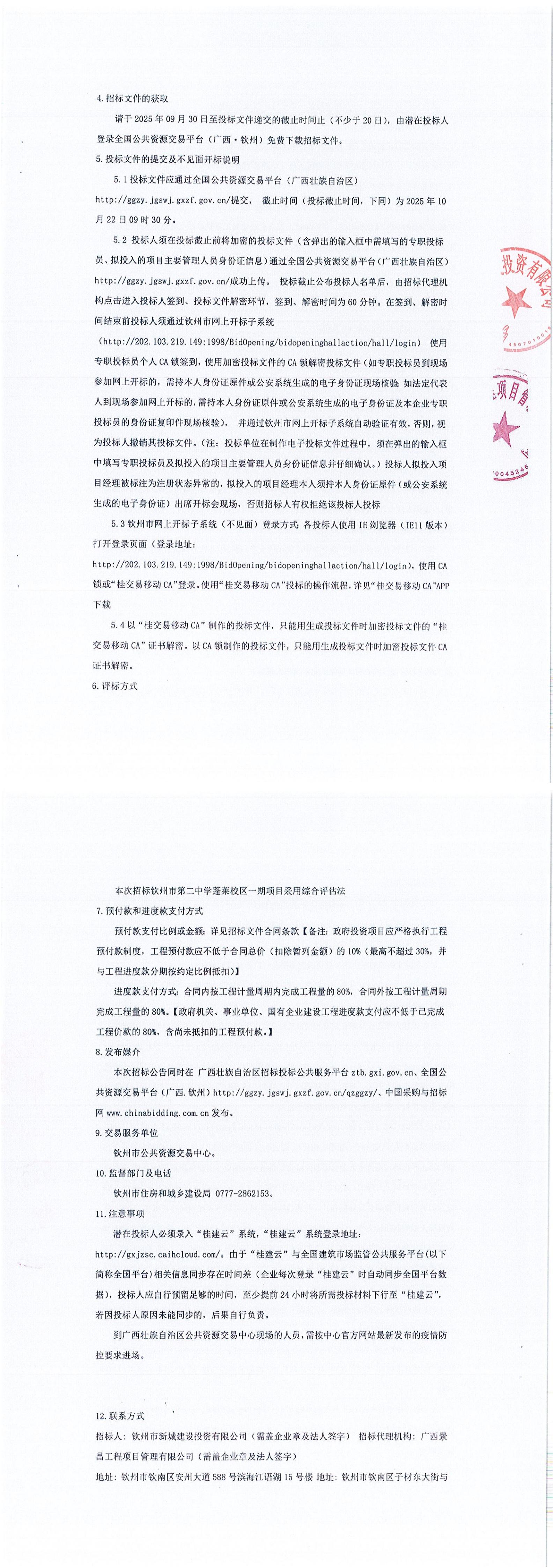 欽州市第二中學(xué)蓬萊校區(qū)一期項目(項目招標(biāo)編號:E4507002846007265001)更正公告(一)