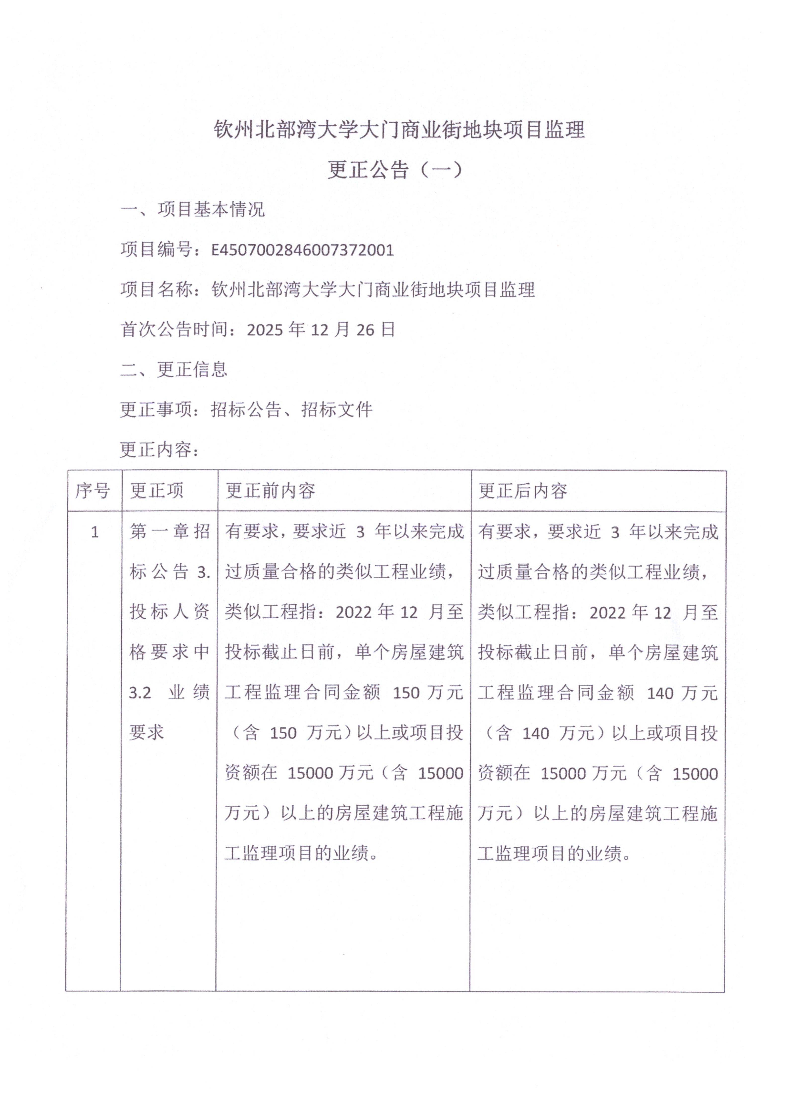 欽州北部灣大學(xué)大門商業(yè)街地塊項日監(jiān)理更正公告(一)