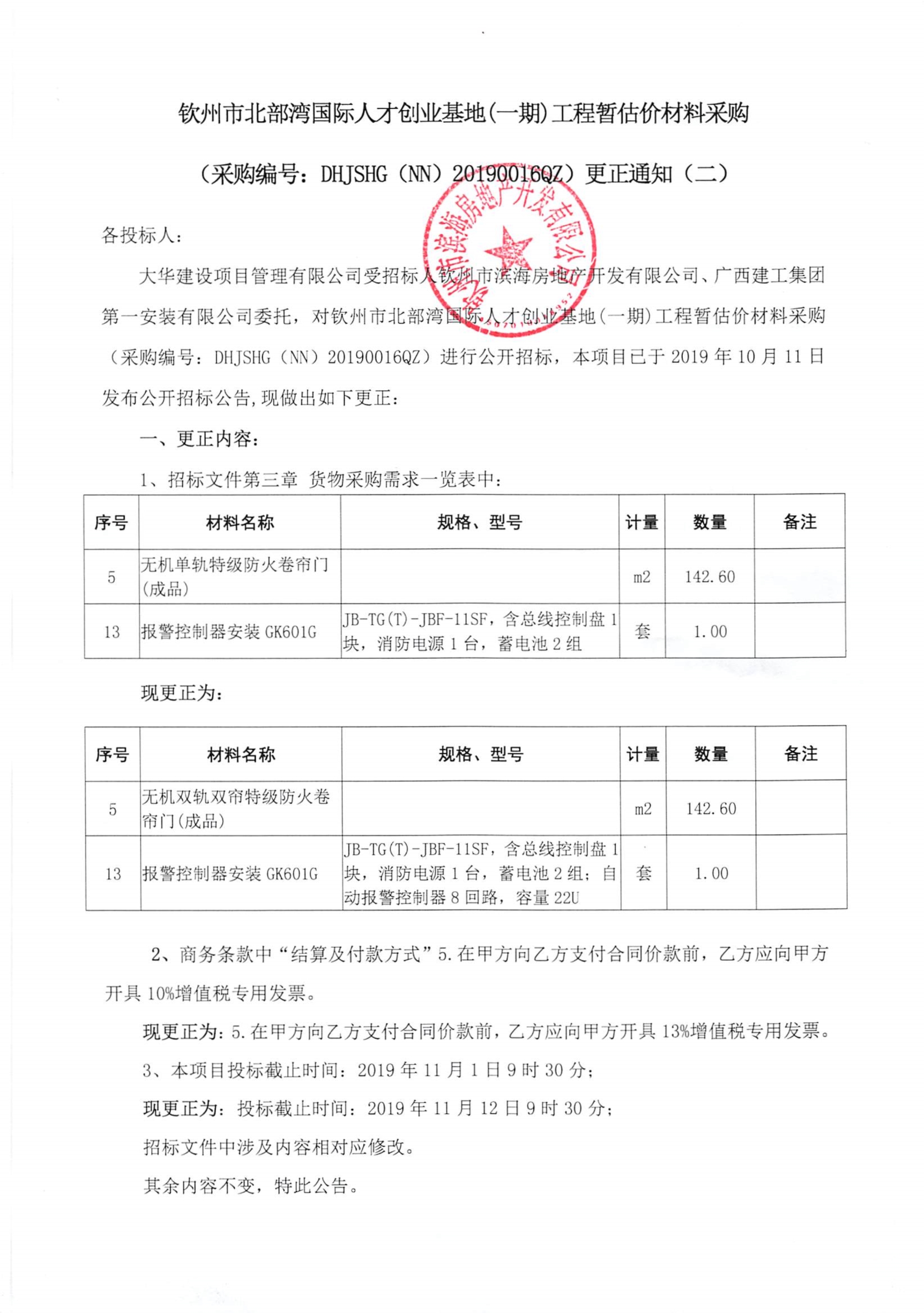 欽州市北部灣國(guó)際人才創(chuàng)業(yè)基地(一期)工程暫估價(jià)材料采購(gòu)更正通知(二)